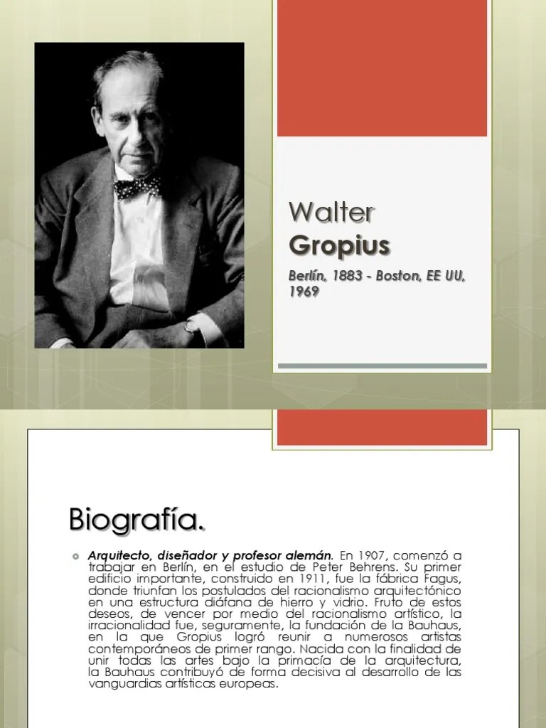 Hijo y nieto de arquitectos. Arquitecto alemán fundador de la bauhaus. De 1907 a 1910 trabajó en el estudio de peter behrens. Vida walter gropius nació en berlín, hijo y nieto de arquitectos. Vida walter gropius nació en berlín, hijo y nieto de arquitectos.