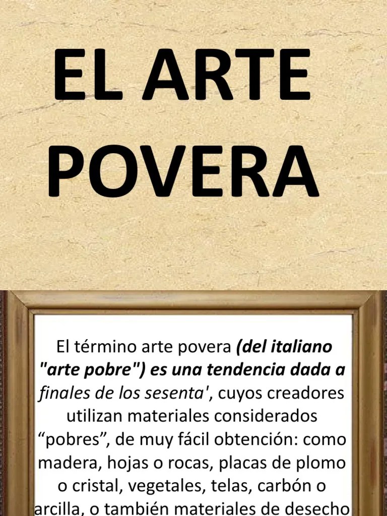 Arte povera (a partir de 1967). El término arte povera (del italiano arte pobre) es una tendencia dada a conocer a finales de la década de 1960, cuyos creadores utilizan materiales considerados pobres, de muy fácil obtención, como madera, hojas o rocas, vajilla, placas de plomo o cristal, vegetales, telas, carbón o arcilla, o también materiales de desecho y, por lo tanto, carecían de valor. Con la eclosión de las primeras poblaciones agrícolas hasta llegar a las ciudades sumérias en el 3700 a.c.06.05.2017 · arte povera, reciclado y artesanía.
